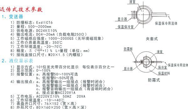 UHC型遠傳式磁浮液位計是專為監(jiān)控各種壓力容器的液位而設(shè)計的專利產(chǎn)品,它可以用在各種容器上進行液位的測量及顯示。本儀表由現(xiàn)場磁浮式液位計,磁耦式位移傳動器,磁耦式液位變送器及控制室內(nèi)液位顯示表四部分組成。磁浮式液位計利用連通器原理同容器連接,從液位計的液位指示器上可直接觀測到液位的變化,同時磁耦式位移傳動器和液位變送器通過電磁轉(zhuǎn)換把液位信號轉(zhuǎn)換成電信號,通過電纜傳輸?shù)娇刂剖覂?nèi)的液位顯示表中,經(jīng)電路處理后在顯示表上利用發(fā)光帶模擬顯示液位,顯示同現(xiàn)場的液位變化同步。顯示表還具有高液位,低液位報警及控制 輸出等項功能。現(xiàn)場磁耦式液位變送器為隔爆型設(shè)計,防爆標志為ExdⅡCT6,產(chǎn)品經(jīng)儀器儀表防爆安全監(jiān)督檢查站審查合格。該產(chǎn)品適用于石油、化工、電站及其它工業(yè)領(lǐng)域的各種容器中液位的監(jiān)測及二次顯示。